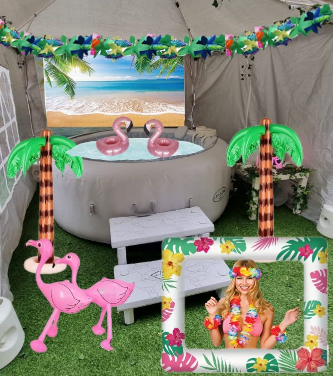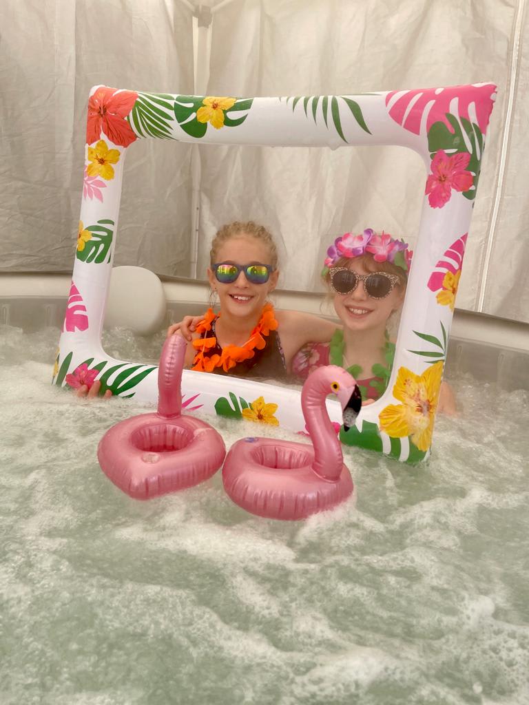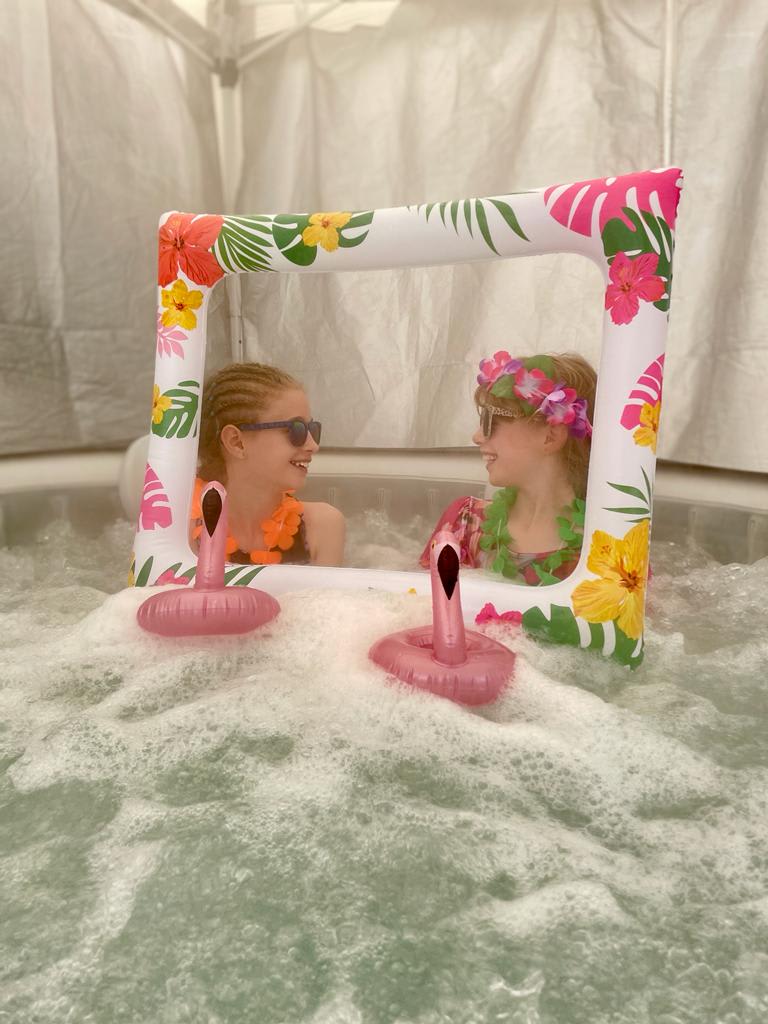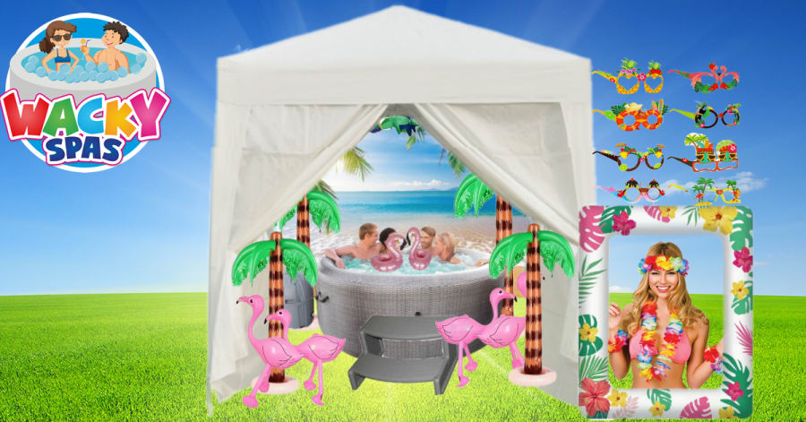 Our Tropical Theme Hot Tub Hire is your escape to paradise, only without the long journeys and stress of travelling. Thats right, we bring the paradise to you at your chosen location. The Tropical Hot tub hire package is a great alternative to a short break away and will save you some ££££’s too. This Hot Tub Hire package has everything needed to enjoy a fun, crazy and most importantly relaxing time. Enjoy the props that are included, such as the funny glasses and floating flamingos while taking photos using the inflatable picture frame. The props included in this spa hire are sure to make your occasion very fun and memorable. You will enjoy looking back at the photos for many years to come. Wacky Spas like to be different to the standard Hot Tub hire companies in Bedfordshire and Hertfordshire, hence why we put a lot of love and thought into each and everyone of our hot tub hire packages. The Tropical themed hot tub is one of our most popular packages as it provides something for everybody, whether you would just like to unwind and chill out after a busy day at work or your looking to have a few nights of fun and laughter. Hot tub hire is a brilliant way to socialise and have a catch up with friends and can also be great for family bonding time too. Another perk to Hot Tub hire is the fact that it can be used pretty much all year round, so not even the winter can ruin your outdoor event, unless it is exceptionally cold but this will be explained prior to booking. The Hot Tub hire package will be set up and packed away by our trained staff so you don’t need to do anything but enjoy. Some of the areas (but not all) thtraie hire our Hot Tubs too, include Hitchin, Letchworth, stevenage, Luton, Bedford, Baldock, Buntingford, Welwyn GC and many more towns in proximity. With all that said, what are you waiting for?! Make your event the talk of the town and book your Hot Tub package now, for your funtastic occasion in Hertfordshire and Bedfordshire. We are confident that you will enjoy, you may even become a Hot Tub addict like many of our repeat customers.